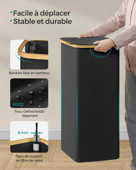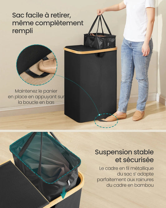 Panier à linge 150 L : Tri facilité avec 3 compartiments, bambou élégant, pliable & pratique