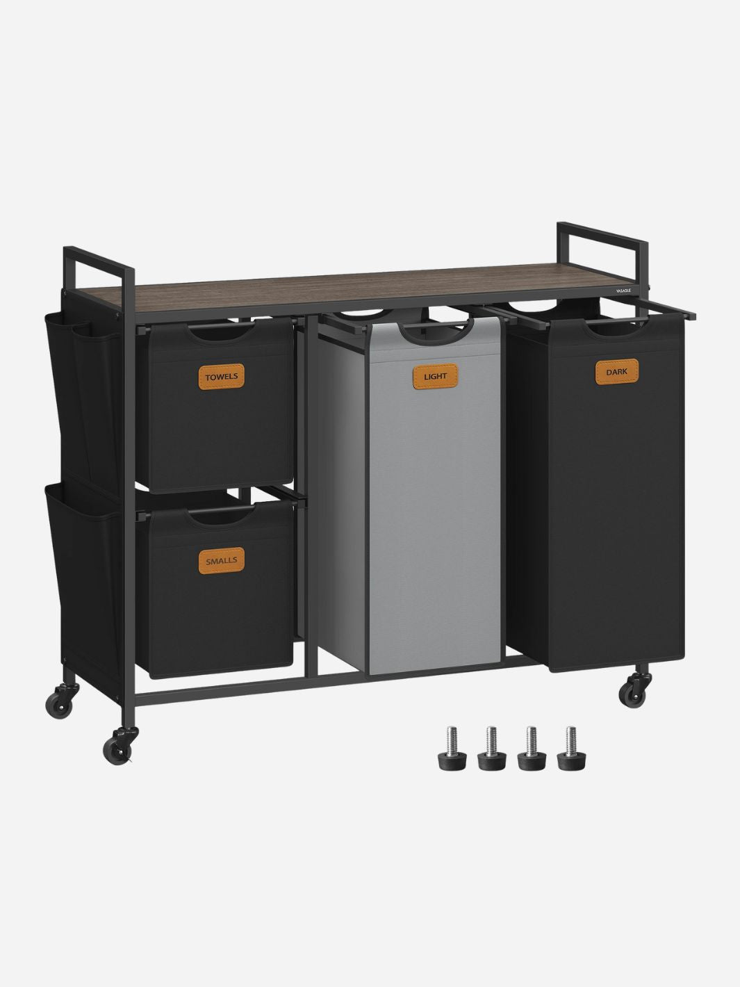 Conçue avec des tubes en acier renforcé de 1,5 × 1,5 cm et un plateau supérieur en aggloméré solide, cette panière supporte jusqu’à 48 kg. Sa surface supérieure est idéale pour poser vos produits de lessive, un panier à linge complémentaire ou des cintres en bois pour préparer vos vêtements propres.